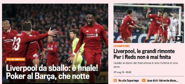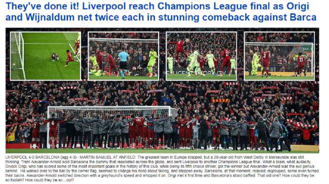 The Sun, en su noticia de apertura, narra jugada a jugada el partido, elogiando cada una de las acciones de un Liverpool "extraordinario". Para el rotativo británico, la capacidad de no dejar de creer fue la clave de la eliminatoria: "Su poder de resiliencia, su capacidad para luchar con el 3-0 abajo en el partido de ida, ya es legendario. Si ganan la Champions, estos muchachos serán inmortales. También opina que Robertson debió ser expulsado: "Tuvo la suerte de evitar la roja después de golpear a Messi".
