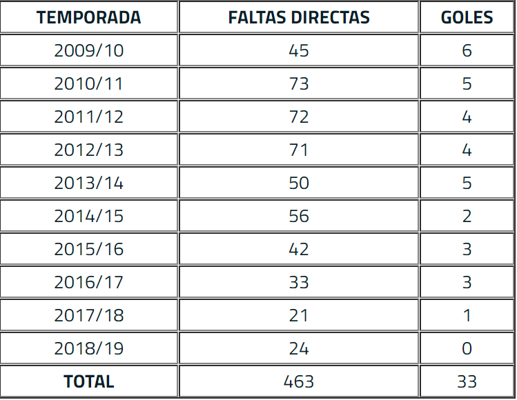 Su mejor temporada fue precisamente la primera en la que llegó al Real Madrid, con 67 lanzamientos y siete goles (10'44% de efectividad), mientras que todavía no se ha estrenado con la Juventus.