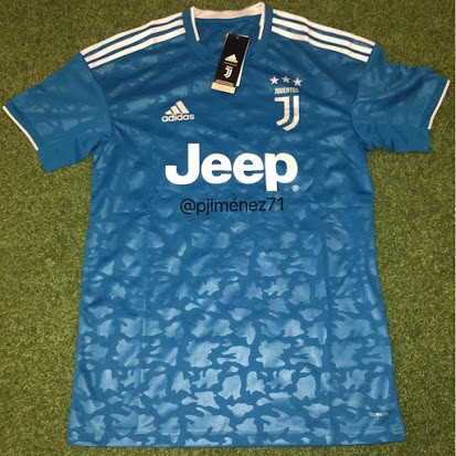 Completing the set is the Juventus 2019-20 third shirt, which is blue with an outstanding jacquard-printed camouflage all-over pattern on the body and sleeves. The logos are 'aero blue', which is a very light, almost off-white color.