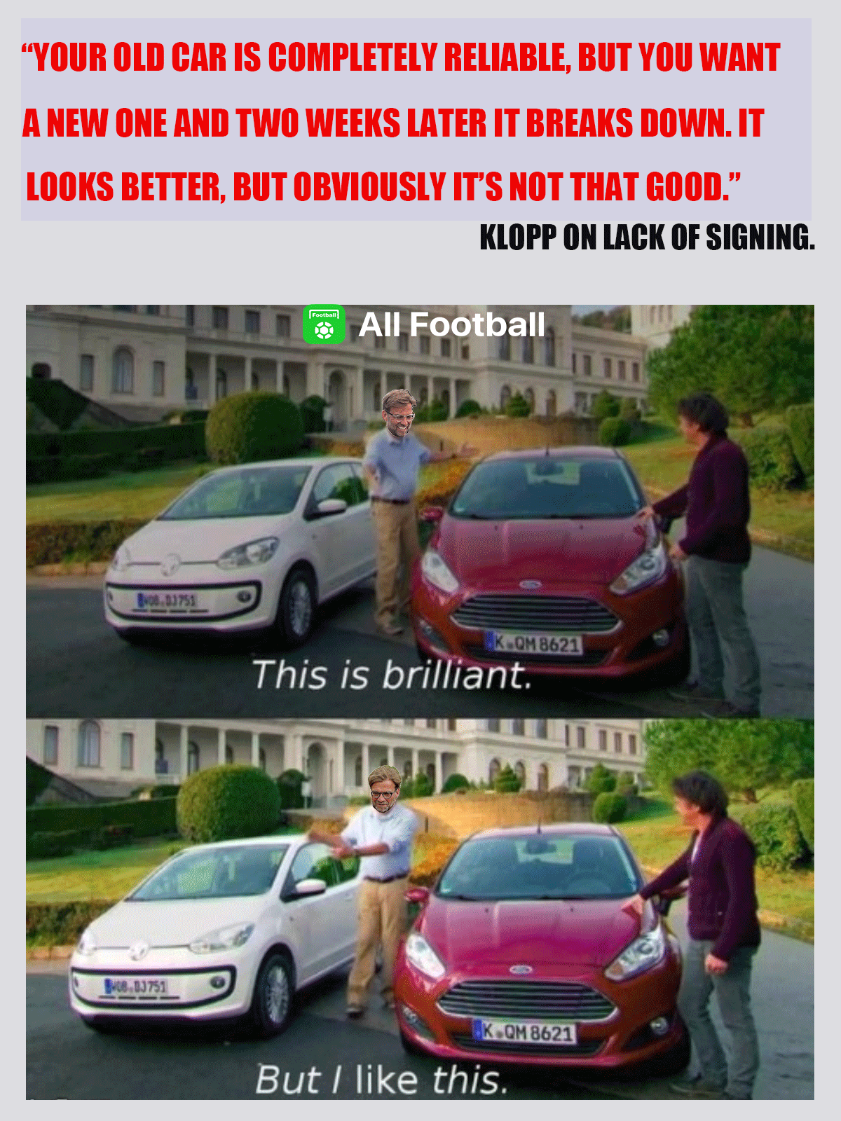 AF MEME: Klopp explained for the lack of signing by his 'Car Theory’, do you agree? ?