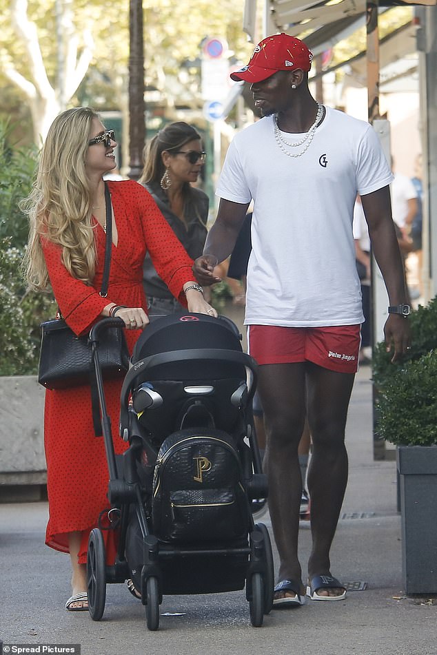 Pogba joins girlfriend Maria and his baby boy for a sunny stroll.