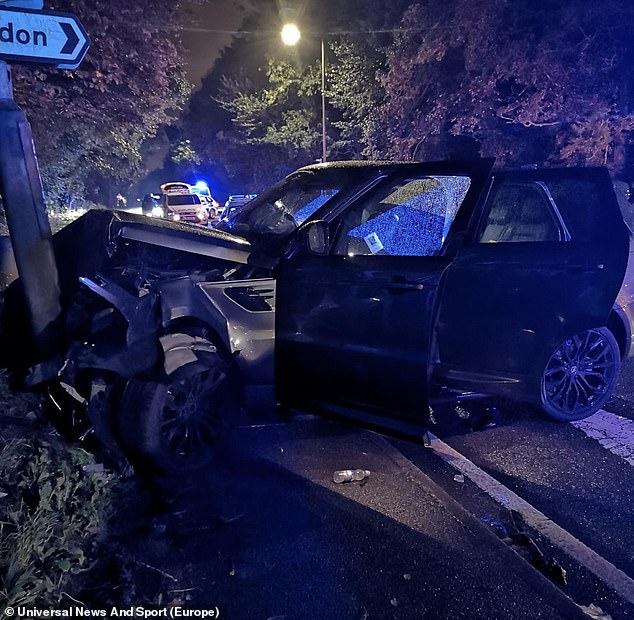 They were arrested at the scene and charged after the crash involving Lawrence’s Range Rover, which was pictured crumpled up after careering into a lamp post, and a Mercedes GLC.