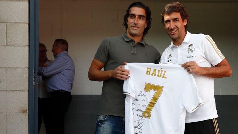 Raúl, entrenador del Real Madrid Castilla, le entregó en el césped una camiseta dedicada y el directivo Nicolás Martín-Sanz le obsequió con otra en el palco de Matapiñonera.