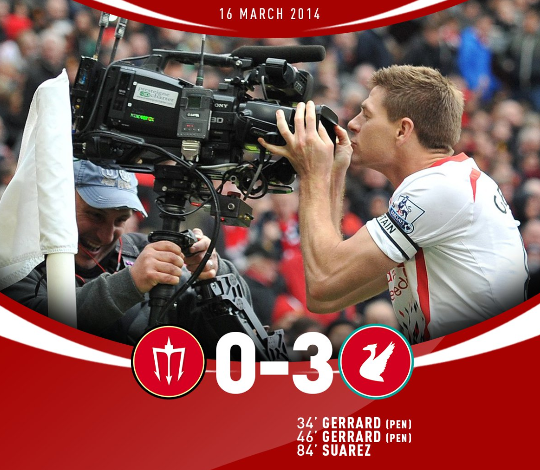 On this day in 2014, Liverpool celebrated their first win at Old Trafford since March 2009 after beating Manchester United 3-0 with Steven Gerrard scoring two penalties.