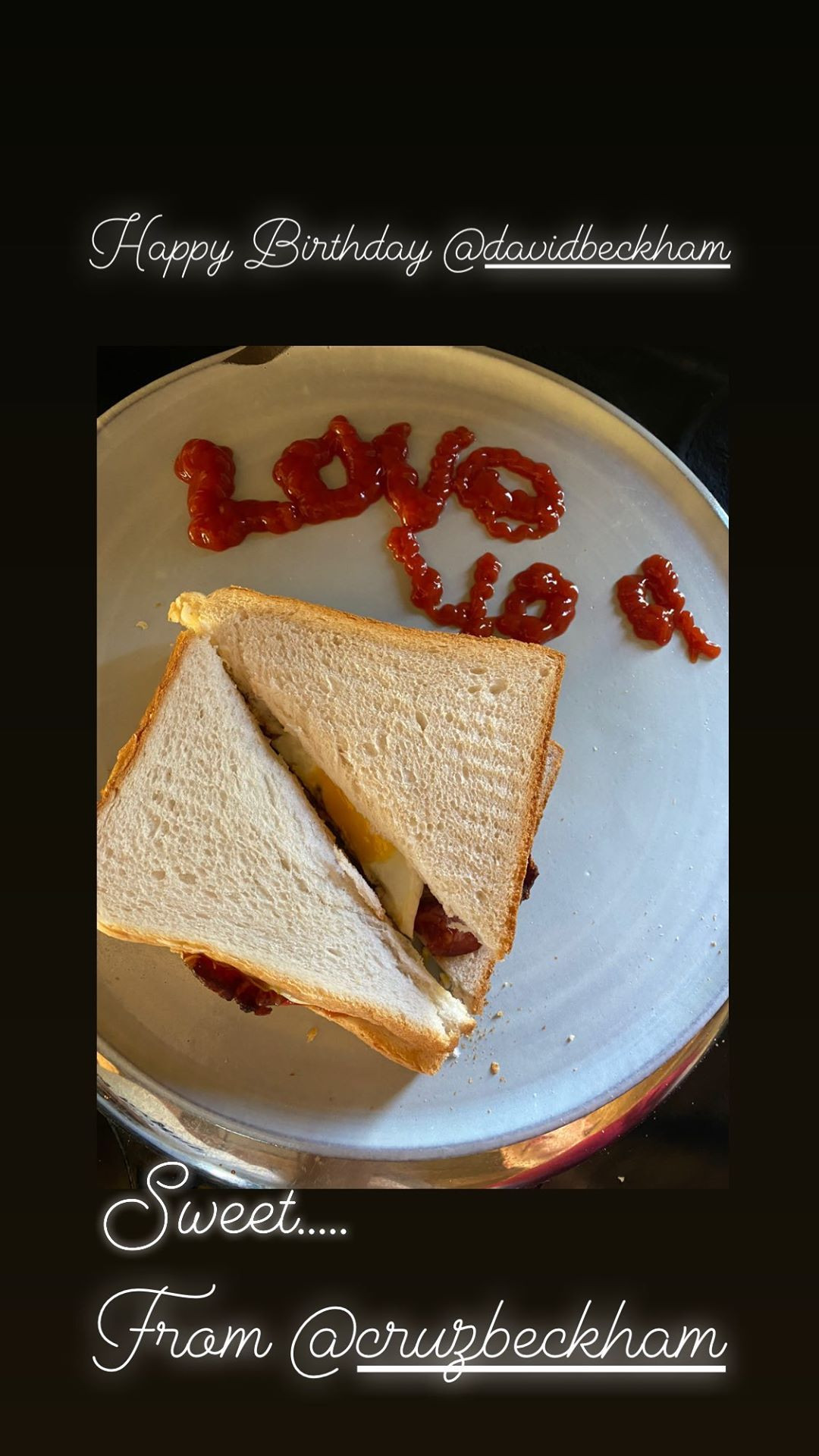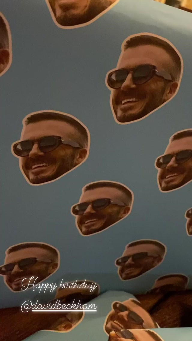 Accompanied by wife Victoria and three of their children, the former Manchester United and England star was treated to a bacon-and-egg sandwich with presents wrapped in paper adorned by his own face.
