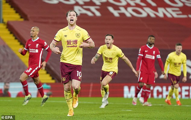 Ashley Barnes netted the decisive goal from the penalty spot to earn Sean Dyche's men the shock win and ensure the Reds suffered their first top-flight defeat at Anfield since a Christian Benteke double saw Crystal Palace emerge victorious nearly four years ago.