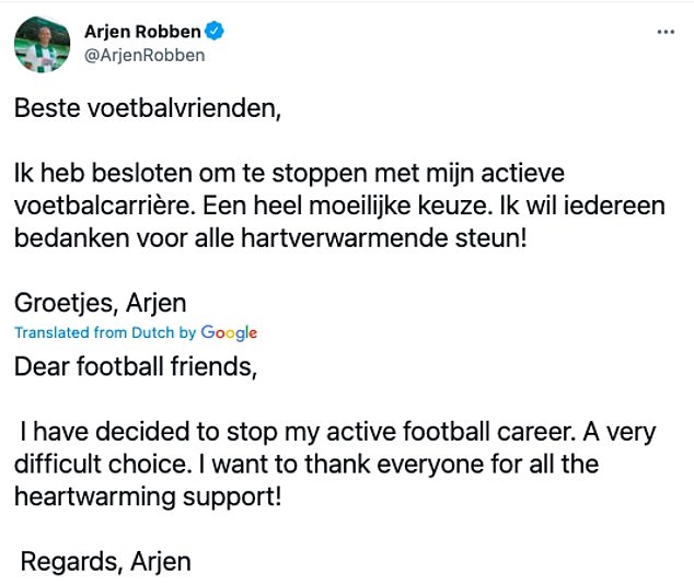 Robben wrote: 'Dear football friends, I have decided to stop my active football career. A very difficult choice. I want to thank everyone for all the heart-warming support.'
