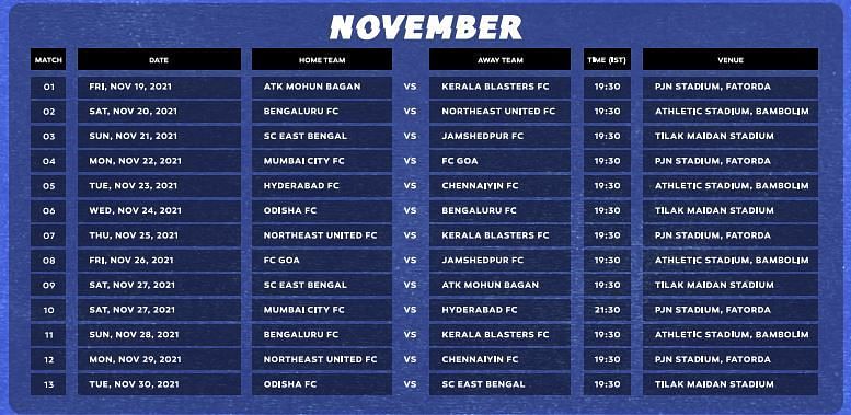 The Indian Super League (ISL) fixtures for the 2021-22 season was announced on Monday. ATK Mohun Bagan and Kerala Blasters will lock horns in the season opener on November 19 at the PJN Stadium in Fatorda.