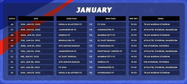 ISL has only announced the fixtures for the first half, i.e. till January 9, 2021. The full schedule will be announced at a later date. Moreover, all the dates and timings are tentative and are subject to change.
