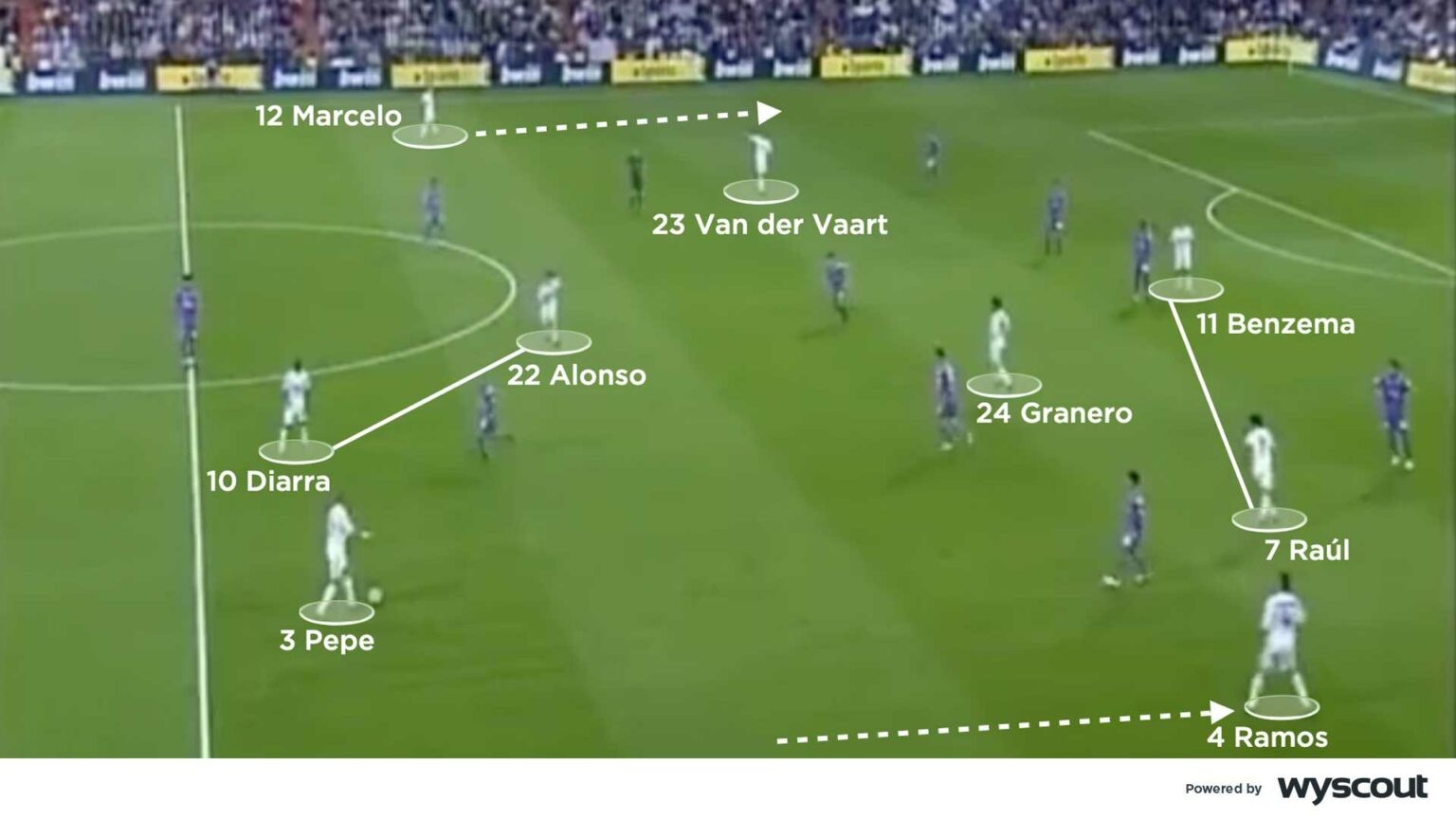 Manuel Pellegrini has used a 4-2-2-2 at Real Madrid, Villarreal, Manchester City and Real Betis, often converting from a 4-2-3-1 or a 4-4-2 in games. With Real Madrid, he used two of Cristiano Ronaldo, Raúl, Karim Benzema and Gonzalo Higuaín up front, with two number 10s selected from Kaká, Esteban Granero, Guti and Rafael van der Vaart. The team's attacking width was provided by overlapping runs from Marcelo and Álvaro Arbeloa – or Sergio Ramos, used as a right-back – while Xabi Alonso and Lassana Diarra played as the double pivot (below).