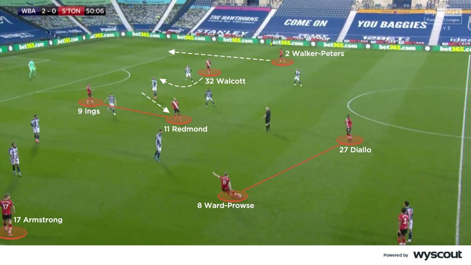 Hasenhüttl has used a 4-2-2-2 shape in both attack and defence, with an aggressive counter-pressing out-of-possession approach and direct, central counter-attacks. With Southampton, the width has been provided by right-backs Kyle Walker-Peters or Tino Livramento, who pushed forward (below), while Danny Ings and Ché Adams formed an impressive and dynamic centre-forward partnership in the 2020/21 season. One of them would drop short, while the right-sided attacking midfielder then pushed higher. The left-sided number 10, meanwhile, took up a wider position, giving more room for one of the double pivot to push forward on that side. The left-back tended to be more reserved than the right-back.