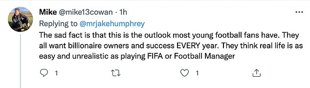 Some blamed young fans for having unrealistic expectations, with one Twitter user writing: 'The sad fact is that this is the outlook most young football fans have. They all want billionaire owners and success EVERY year. They think real life is as easy and unrealistic as playing FIFA or Football Manager.'