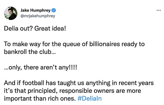 Podcaster and author Jake Humphrey wrote of the protests: 'Delia out? Great idea! To make way for the queue of billionaires ready to bankroll the club… …only, there aren’t any!!!!