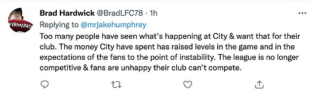 Another agreed, adding: 'Too many people have seen what’s happening at City & want that for their club.