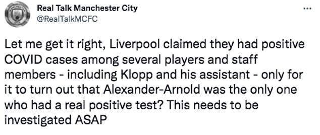 A Manchester City fan page stated: 'Let me get it right, Liverpool claimed they had positive COVID cases among several players and staff members - including Klopp and his assistant - only for it to turn out that Alexander-Arnold was the only one who had a real positive test?