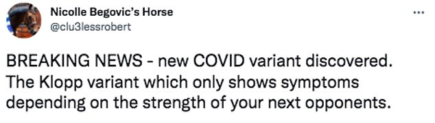 Opposition fans have not missed the opportunity to scrutinise those comments, with one saying: 'BREAKING NEWS - new COVID variant discovered. The Klopp variant which only shows symptoms depending on the strength of your next opponents.'