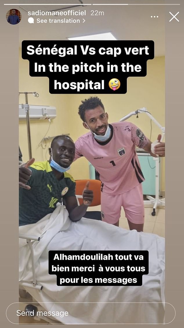 A couple of hours after the match, Mane and Vozinha were pictured together smiling and giving the thumbs up from hospital, with the Liverpool forward writing: 'Everything is fine, thank you all for the messages.'