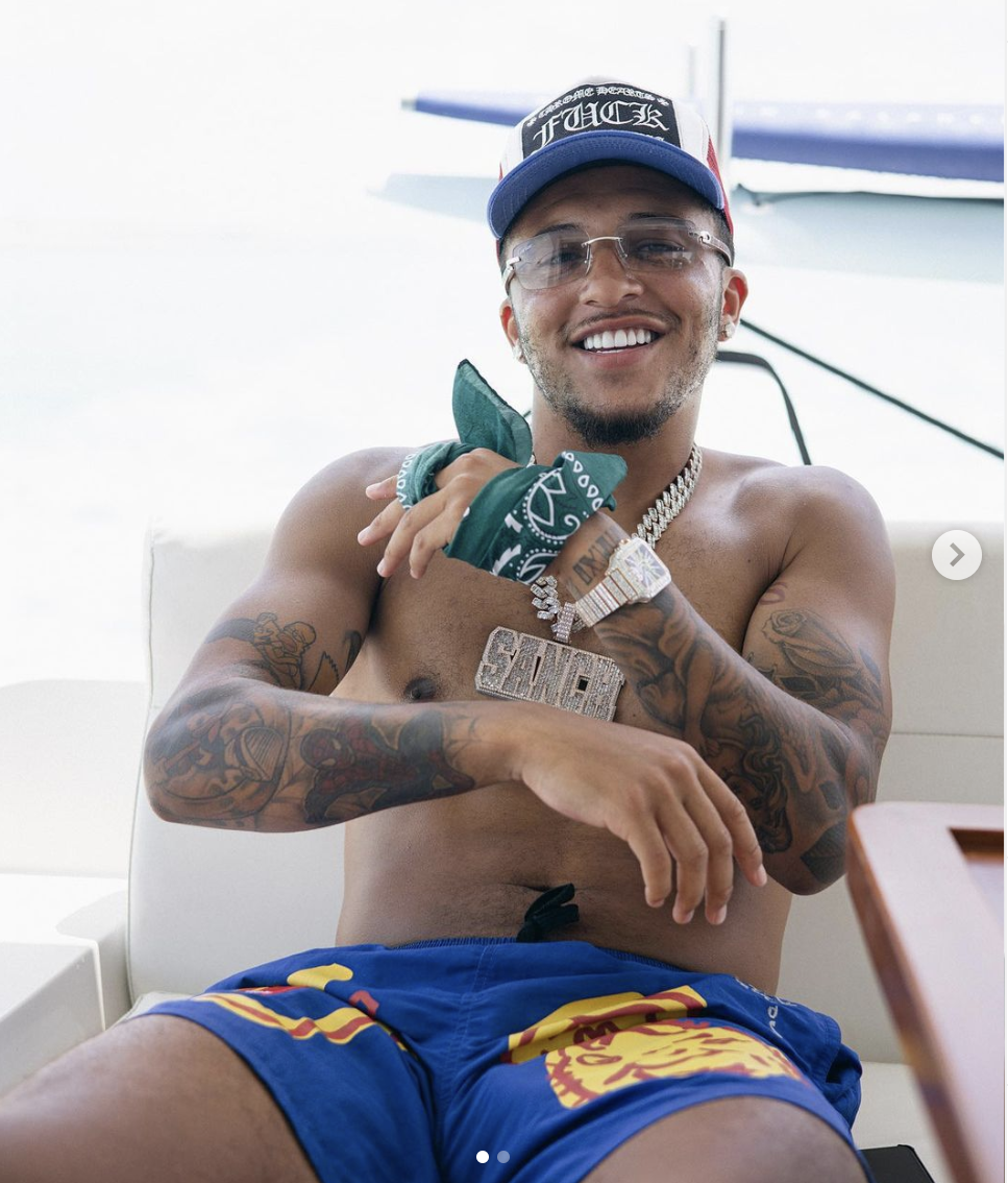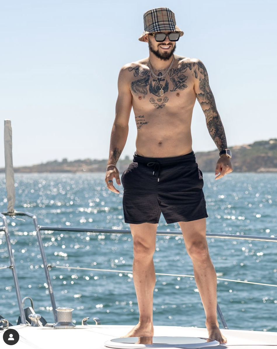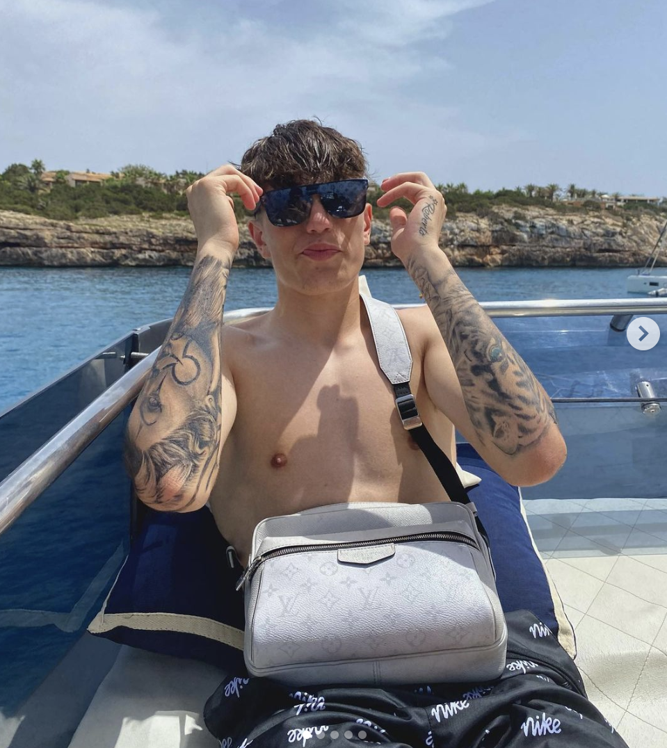 Currently in Ibiza, he shared a photo on a speed boat adjusting his shades, while clutching a Louis Vuitton man bag.
