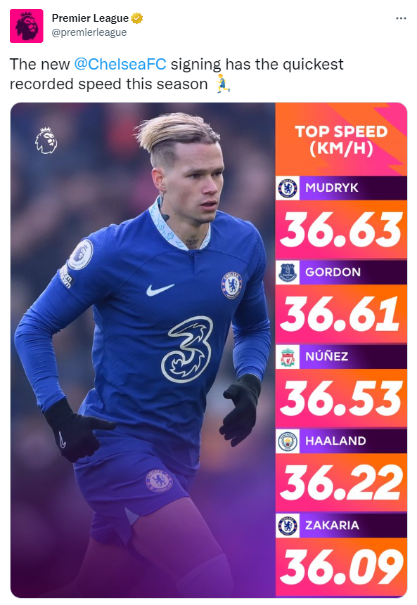 According to statistics released by the Premier League, Mudryk reached 36.63 km/h against the Reds, the quickest recorded speed this season.