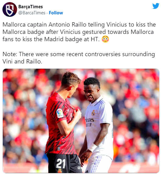 And Raillo rubbed salt in the wounds by trolling Real winger Vinicius, who he has had run-ins with before. At half-time, the Brazilian was seen gesturing towards the Real badge and angering Mallorca fans as he walked back down the tunnel.
