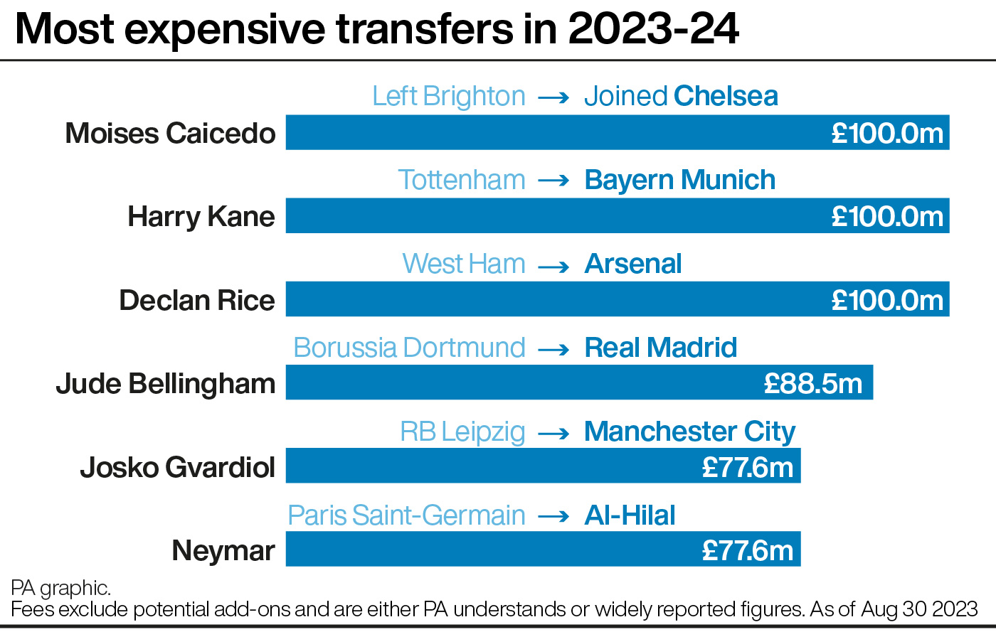 Moises Caicedo, Harry Kane and Declan Rice all moved for an initial £100m, with Brighton, Tottenham and West Ham extracting club-record fees for their prized assets.