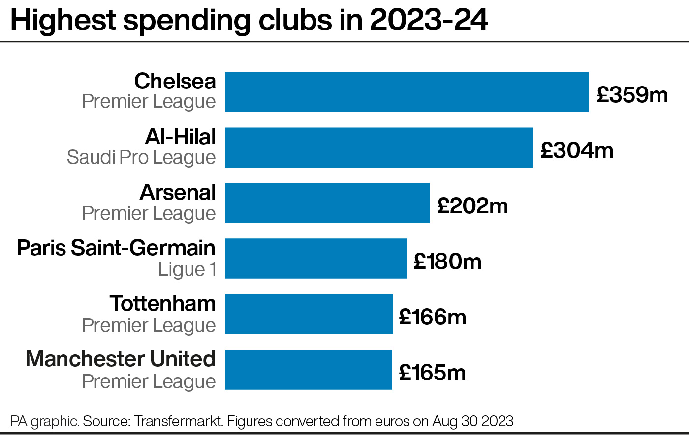 Unlike previous windows, however, Saudi Arabia’s Al-Hilal (£304m) are the second-highest spending club, ahead of Arsenal (£202m), PSG (£180m), Tottenham (£166m) and Manchester United (£165m).
