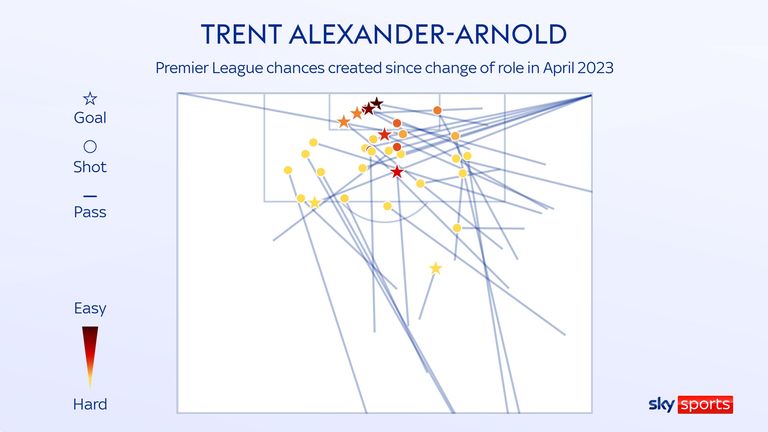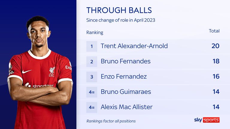 The difference is that the others high on that list are goalkeepers and defenders, doing so from deep. Alexander-Arnold does it closer to the opposition goal now. He has made more through balls than any other Premier League player since the change of role.