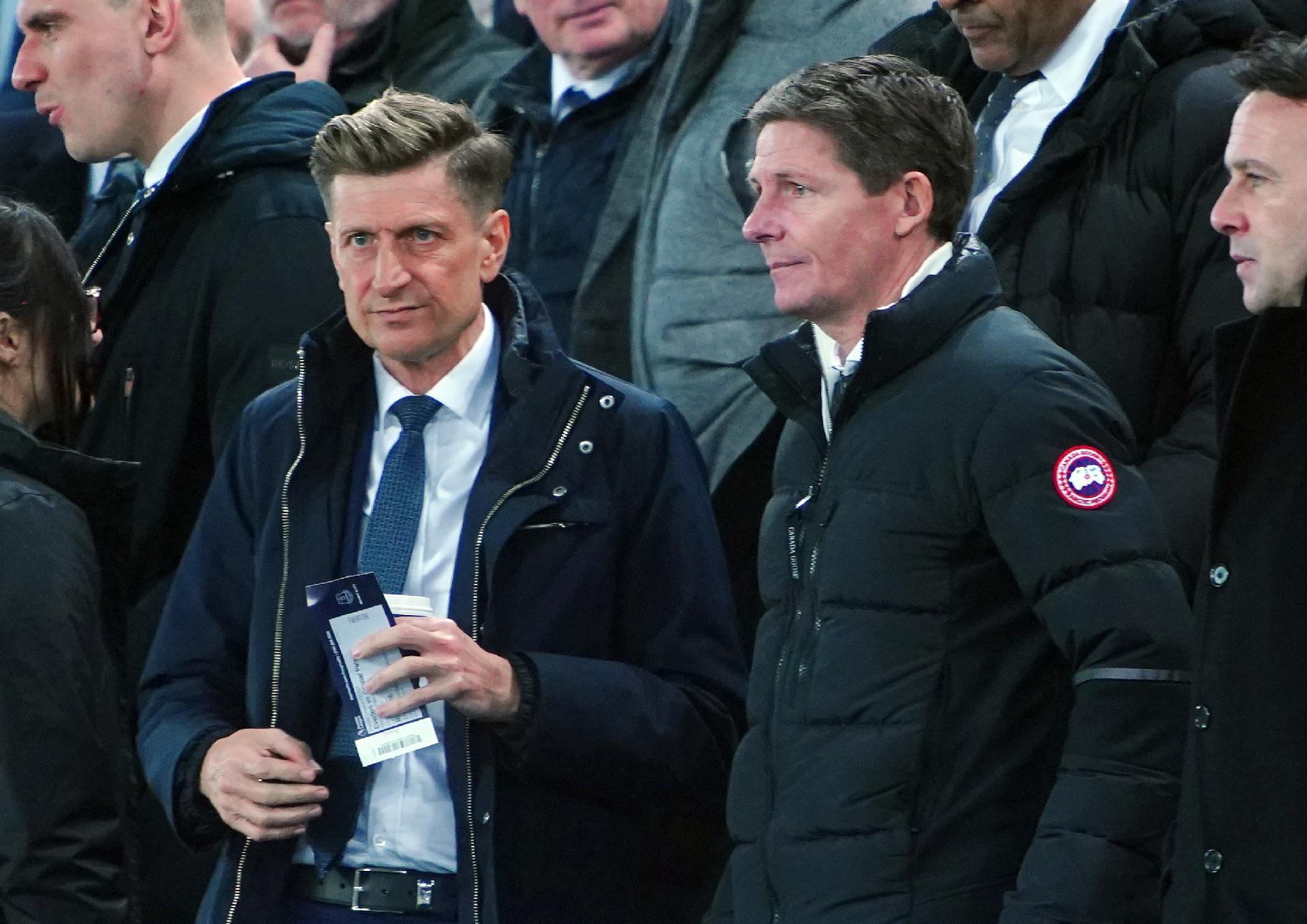 New Crystal Palace manager Oliver Glasner alongside chairman Steve Parish during the Premier League match at Goodison Park