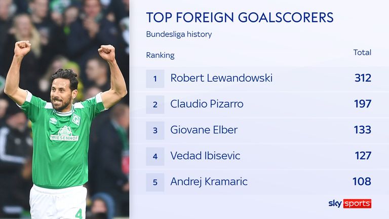 Pizarro, now 45, became a byword for Bundesliga longevity, finally quitting at 41. He retired as a two-club legend, having scored over 100 goals for both Bayern and Werder Bremen. Robert Lewandowski is the only foreign player to score more in the competition.