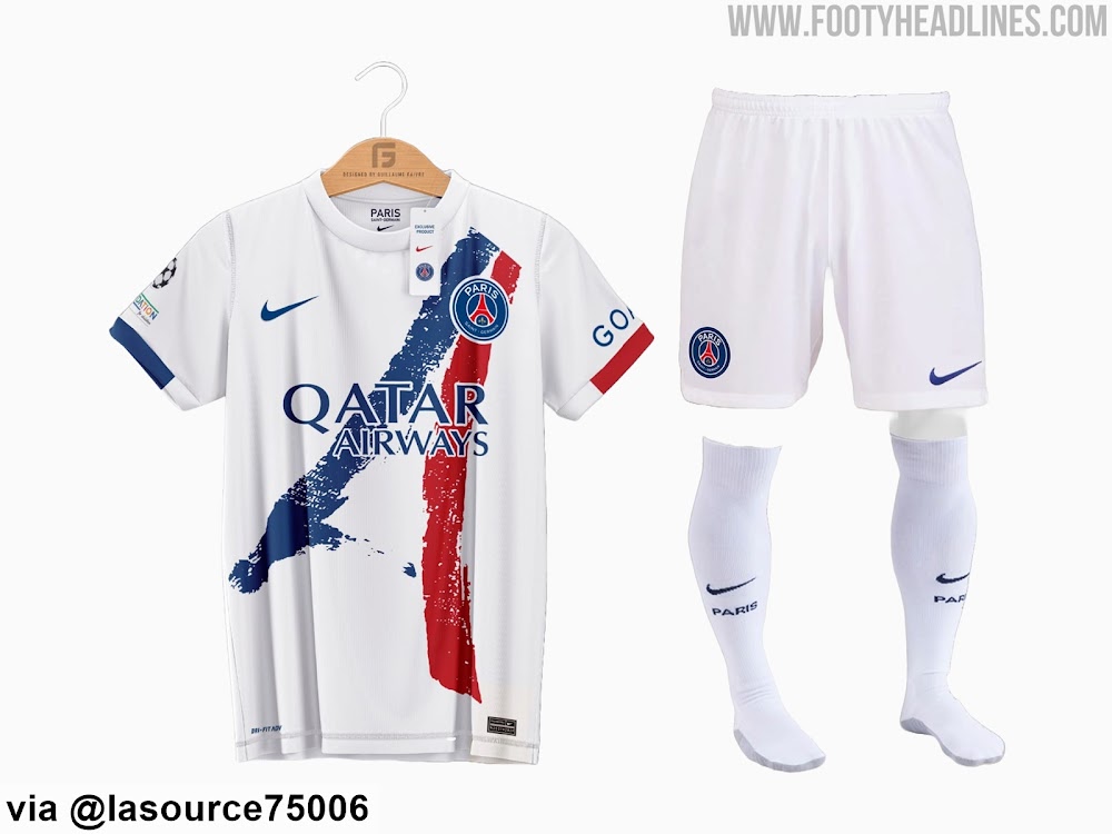Update: The PSG 24-25 away strip pays homage to the city with a graphic inspired by the Eiffel Tower. Now, this evening, an accurate mock-up of the shirt was shared by experts La Source Parisienne (@lasource75006). It should feature not only the correct base design but also the correct details for elements like the sleeve cuffs.