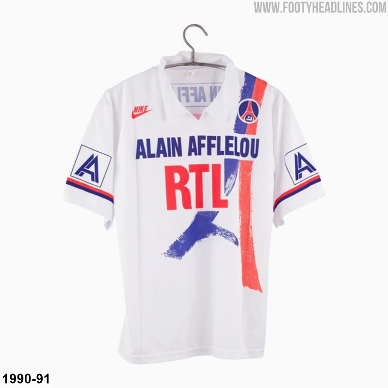 The Nike PSG 24-25 away football shirt has a graphic of the Eiffel Tower. This is a reference jersey for the Paris 2024 Olympics, but also inspired by the 1990-91 away kit.
