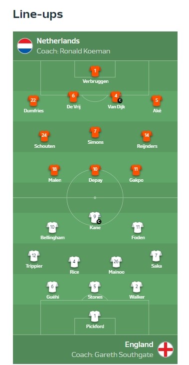 欧足联官方站位图:荷兰队4-3-3阵型,英格兰3-4-2-1阵型