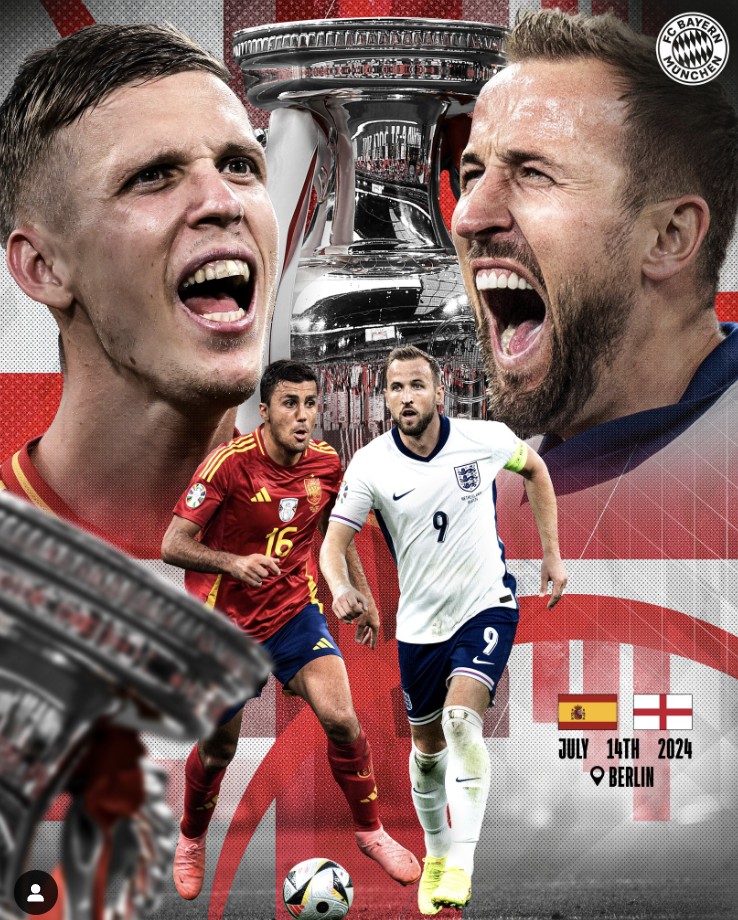 北京时间7月15日凌晨3点,欧洲杯决赛,西班牙队将对阵英格兰队。赛前,拜仁慕尼黑足球俱乐部官方发布了一张预热海报。