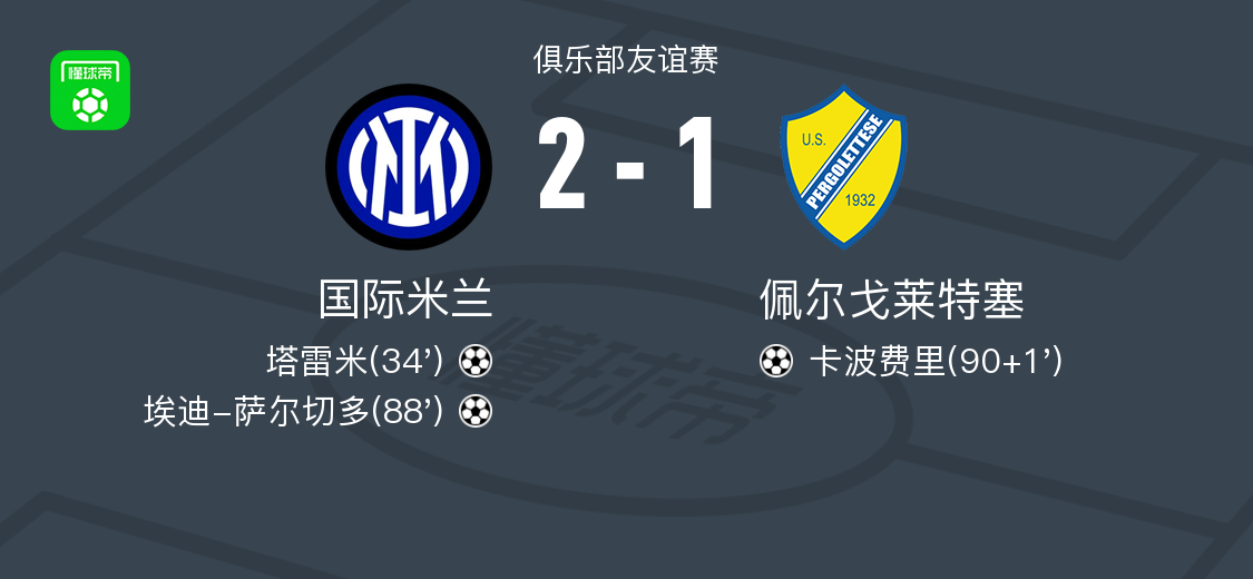 国米2-1佩尔戈莱特塞,塔雷米低射破门,萨尔切多替补建功