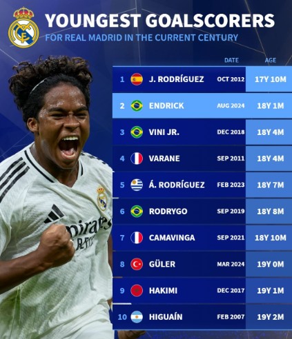 18岁1个月04天,恩德里克是皇马21世纪进球第二年轻的球员