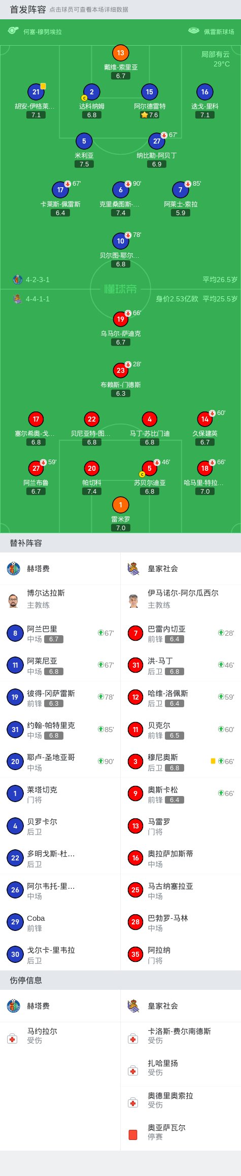 赫塔费0-0闷平皇家社会,皇家社会全场仅一次射门