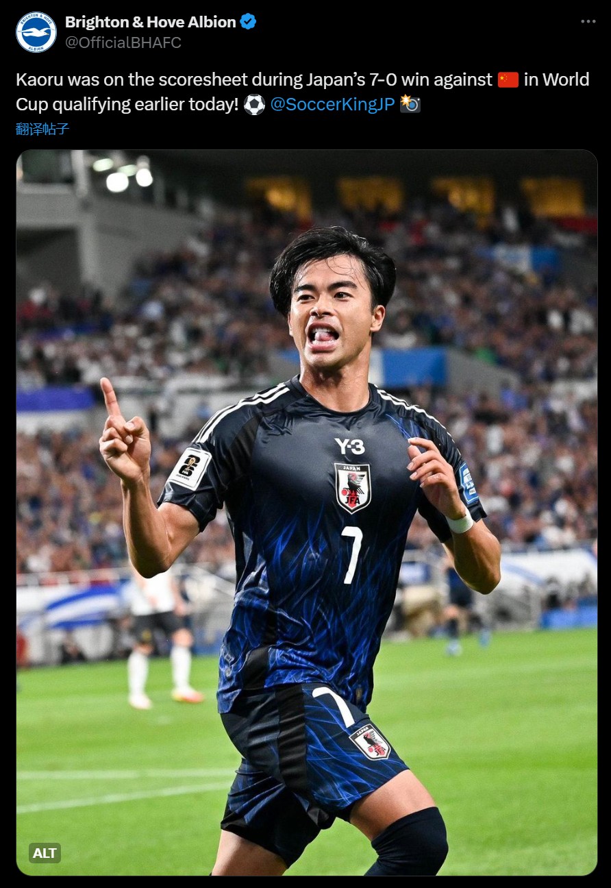 赛后,三笘薰所在俱乐部布莱顿发文:在今天早些时候的世界杯预选赛中,日本队7-0战胜中国队,三笘薰在本场比赛完成进球!