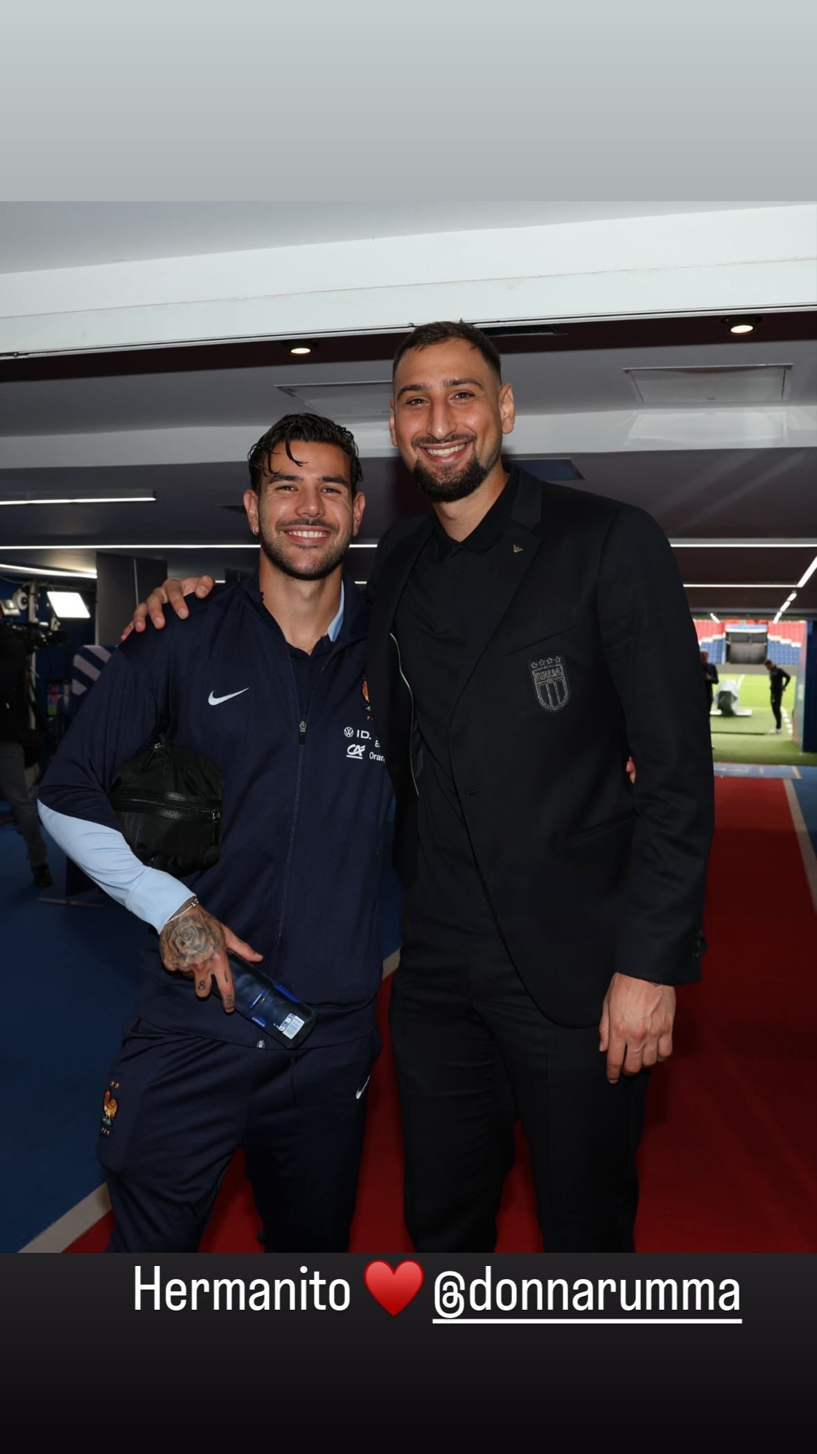 北京时间9月7日凌晨2:45,欧国联A级联赛,法国队将主场对阵意大利队,法国队后卫特奥在社交媒体晒出他与意大利门将多纳鲁马的合照,并配文:“小兄弟❤️(Hermanito)”