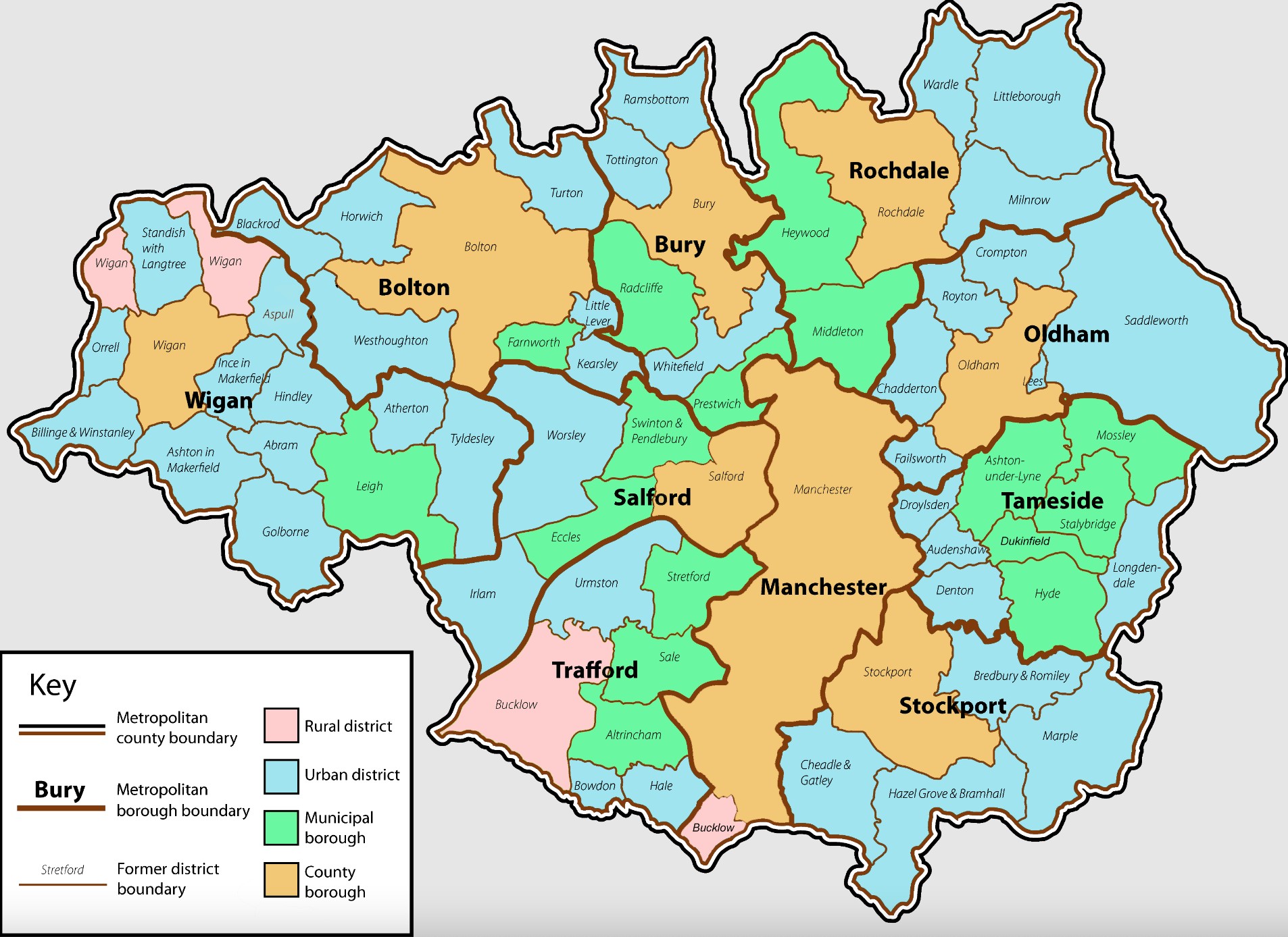 大曼彻斯特郡又包括了曼彻斯特、博尔顿、伯里、奥尔德姆、罗奇代尔、索尔福德、斯托克波特、泰姆赛德、特拉福德和维冈等10个都会区。其中,曼城主场位于曼彻斯特区东部,曼联主场则位于特拉福德区的斯特雷特福德镇。