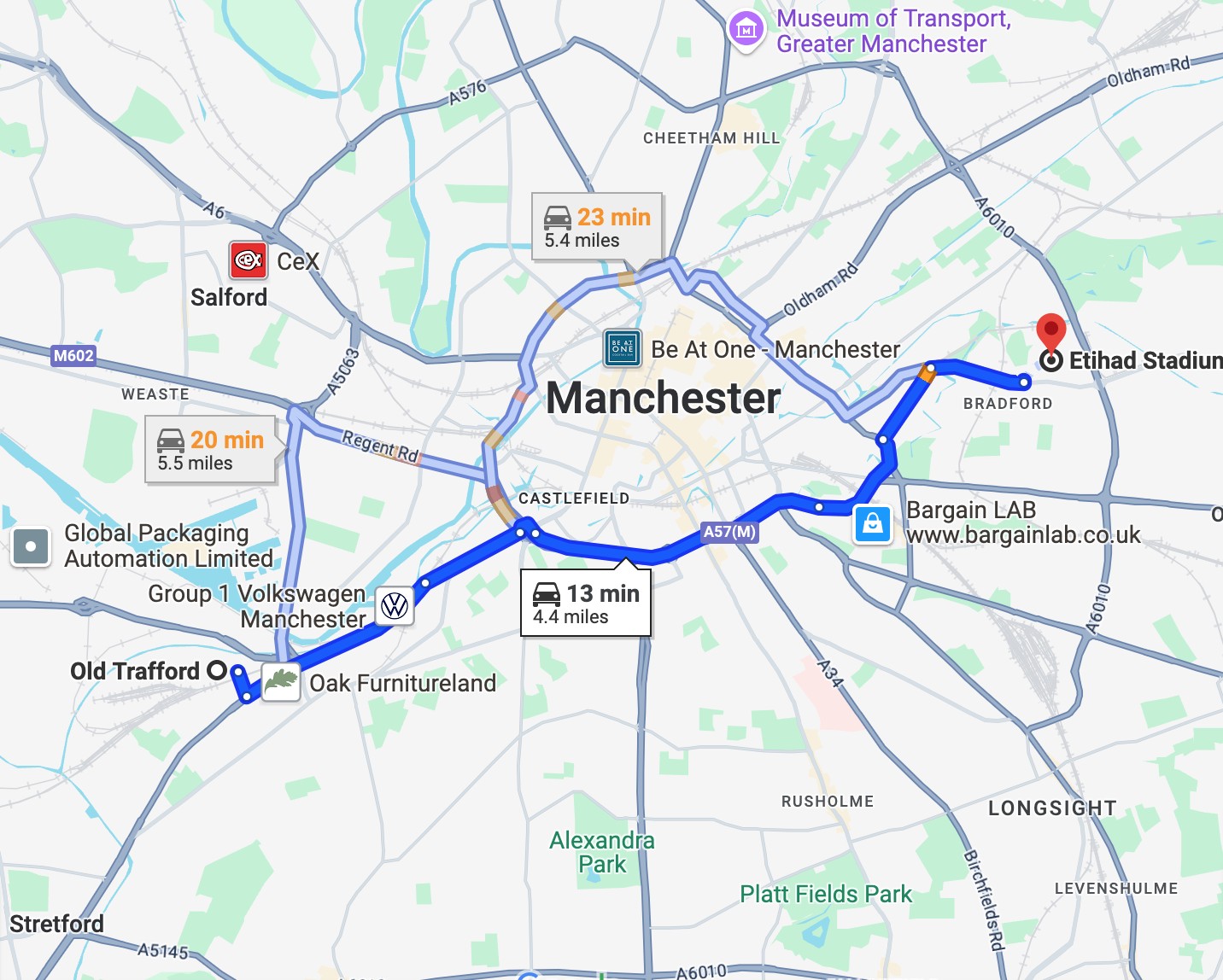 在曼彻斯特,老特拉福德球场与阿提哈德球场直线距离仅6.4公里,如果驾车,只需要13分钟。伴随着曼城的崛起,曼市德比已经成为如今世界足坛最受关注的同城德比。