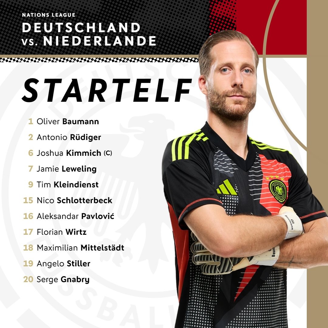 欧国联A级联赛,德国队主场对阵荷兰队,鲍曼和莱韦林迎来德国国家队生涯首秀,施蒂勒和帕夫洛维奇迎来首次首发。