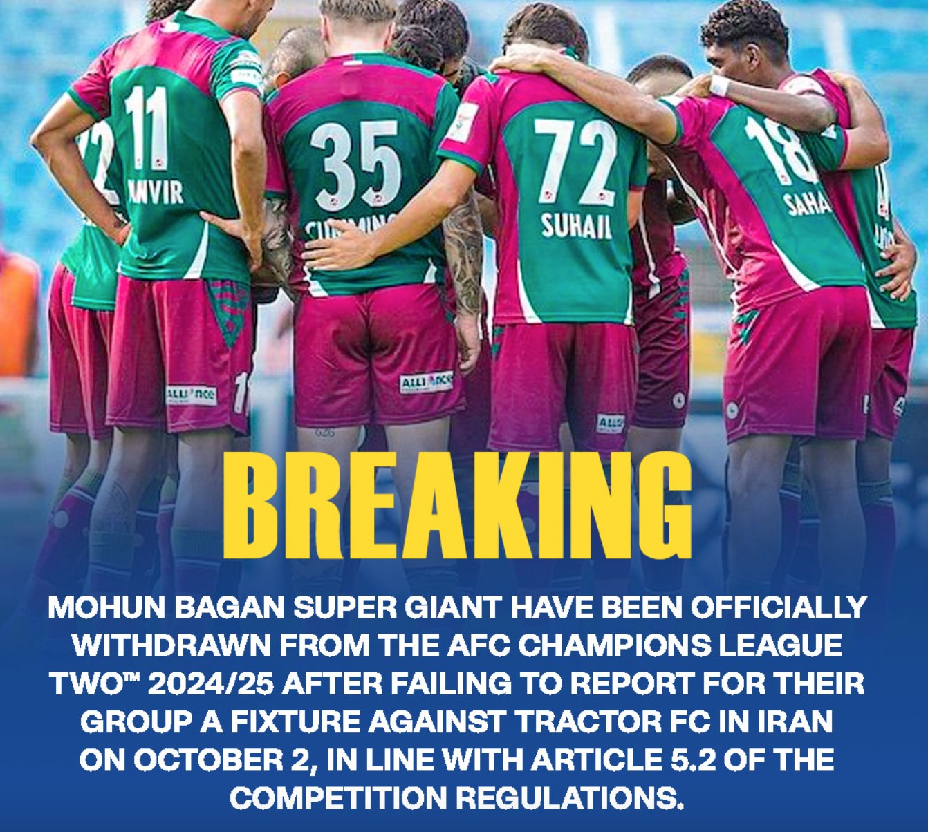 莫亨巴根足球俱乐部原定于10月2日在伊朗大不里士的亚德佳尔体育场与伊朗球队大不里士拖拉机进行本赛季亚冠2级联赛的比赛。然而,在真主党头目被以色列国防军击毙后,伊朗和以色列之间的紧张局势进一步升级,并最终导致伊朗在比赛前一天向以色列发射导弹。出于对安全局势的考虑,最终莫亨巴根队选择不前往客场进行比赛。