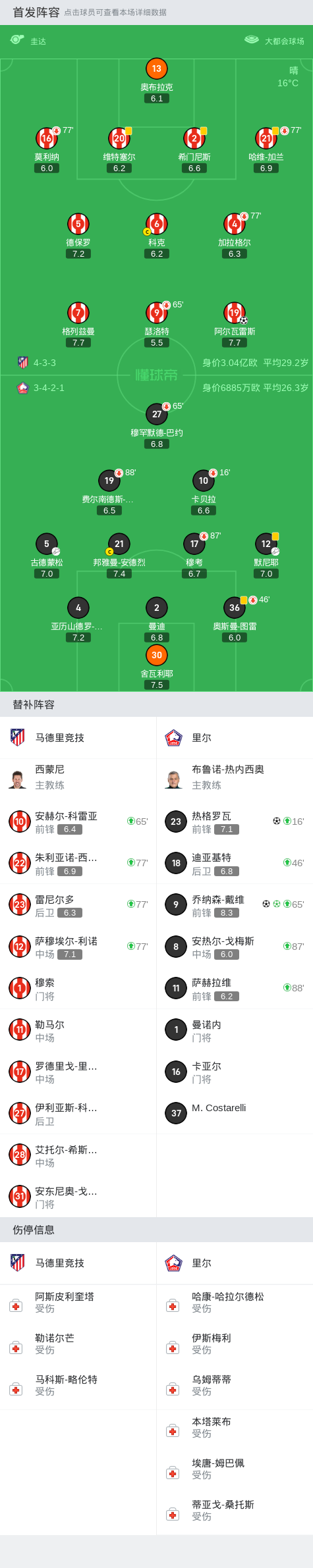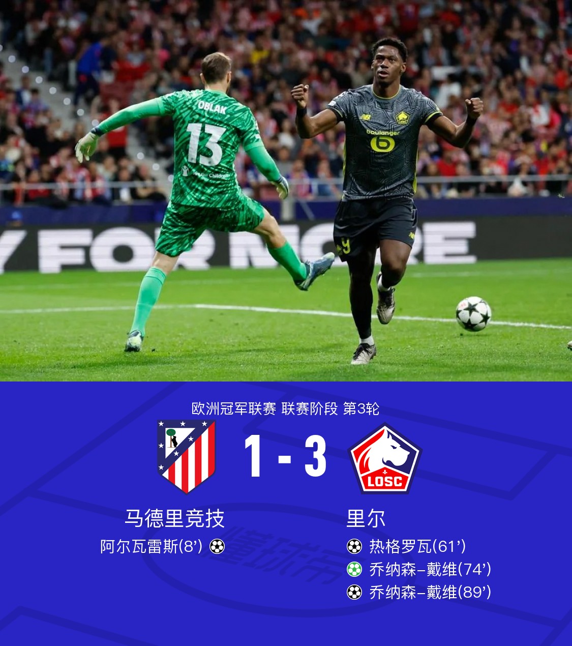 马竞主场1-3遭里尔逆转,乔纳森-戴维双响,瑟洛特三失良机