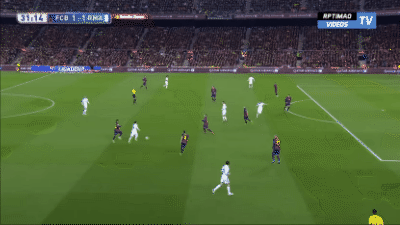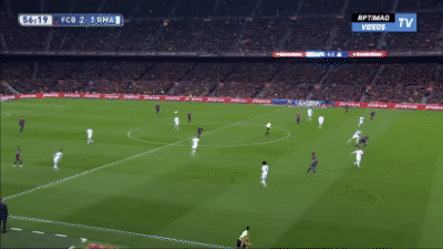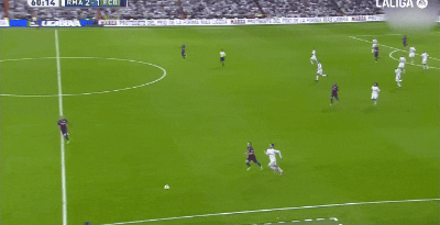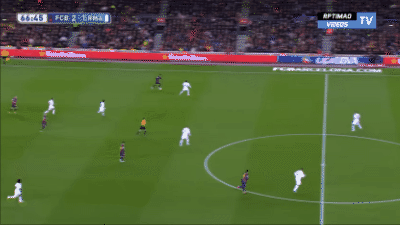 随后梅西内切,苏亚雷斯与内马尔迅速拉边,梅西弧顶兜射稍稍偏出。当落后的皇马大举压上,MSN一次次打出灵巧的三角配合,尤其第74分钟这次,拉基蒂奇将球敲给苏亚雷斯,苏神回敲梅西后转身反跑,梅西带球向前时轻松拥有了两个出球点,MSN形成三角配置,梅西将球分给内马尔,可惜内马尔射门踢偏。