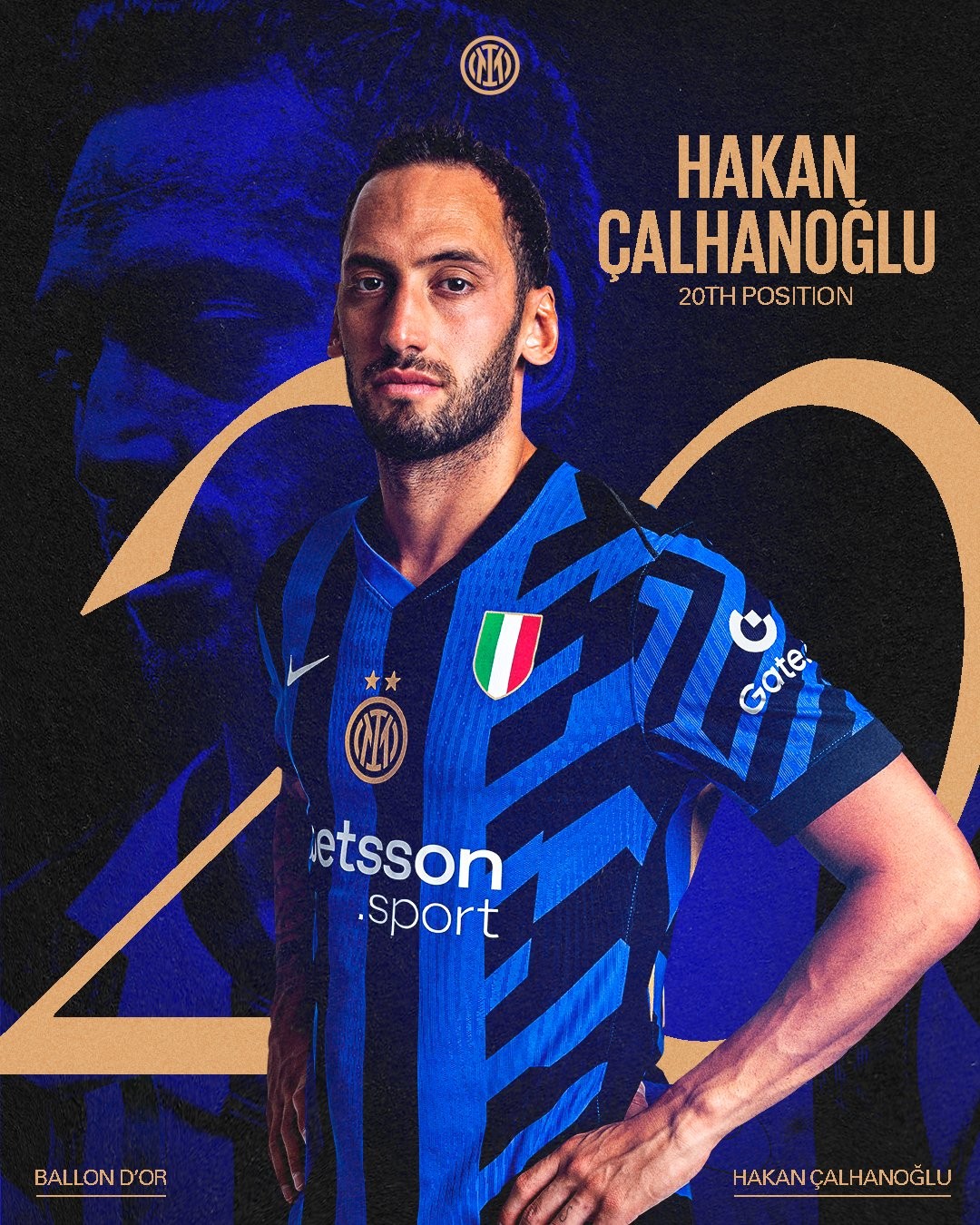 恰尔汗奥卢排名金球奖评选第20位,国米官方发文祝贺