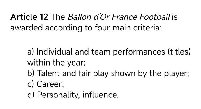 看到一个法国记者写道,维尼修斯没有拿到金球奖,是因为金球奖的第三条评选标准对公平竞赛有要求。还看到有的说法,说这个条款是欧足联去年与《法国足球》合作后加入的。