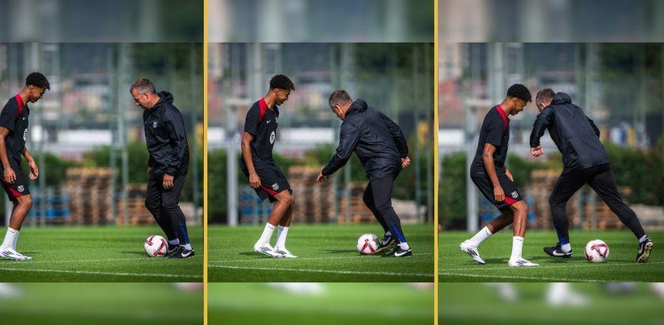 这可能是教练与球员之间的一次玩笑,也许是在训练中的一次较量或挑战。但这也可能是弗里克的一次教学示范,或许很快就会揭晓答案。