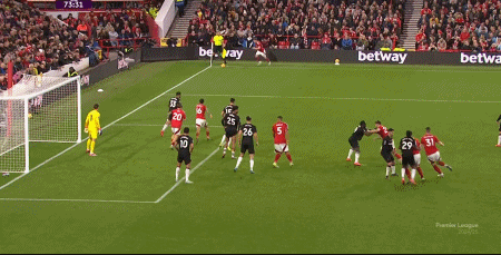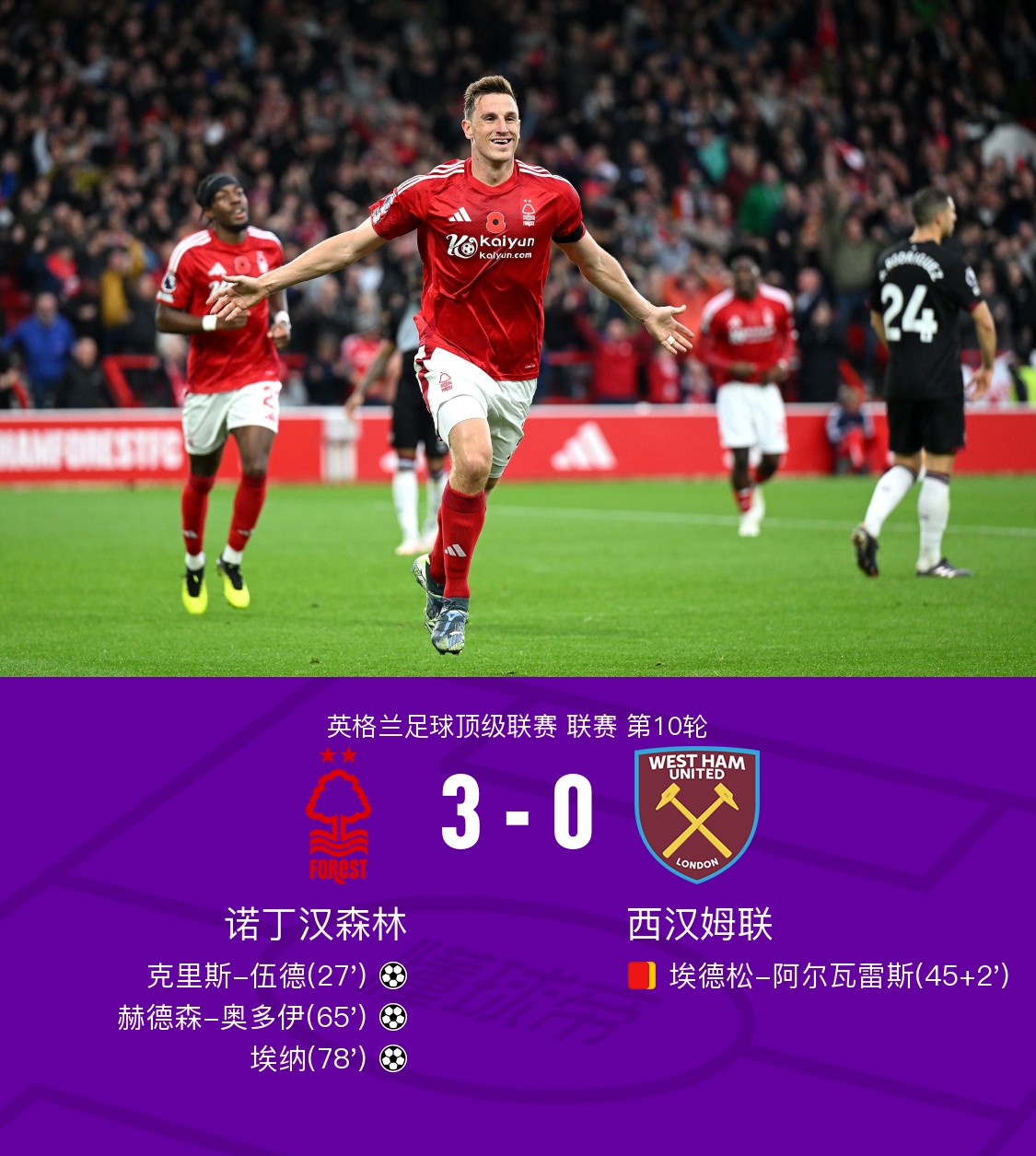 诺丁汉森林3-0十人西汉姆取三连胜,埃纳世界波,奥多伊破门