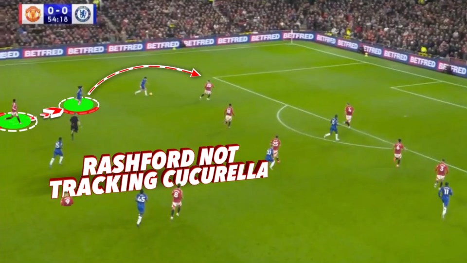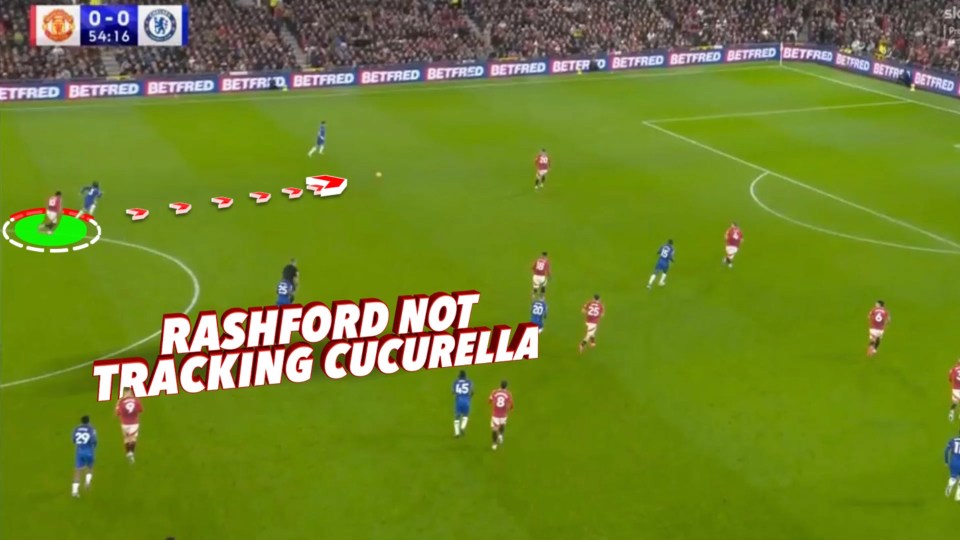 It's his man, and Rashford starts to sprint and then lets him go, a bit like Dalot in the Tottenham game, and he was very lucky that Chelsea didn't score from that incident.