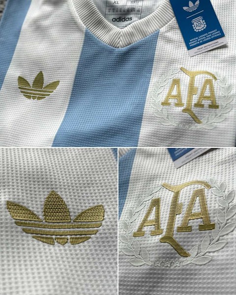 其中,球衣整体依旧为阿根廷国家队经典的蓝白色调,阿迪达斯与阿根廷足协的徽章标识为金色,队徽旁边的桂花环为白色,袖口与领口为白色。